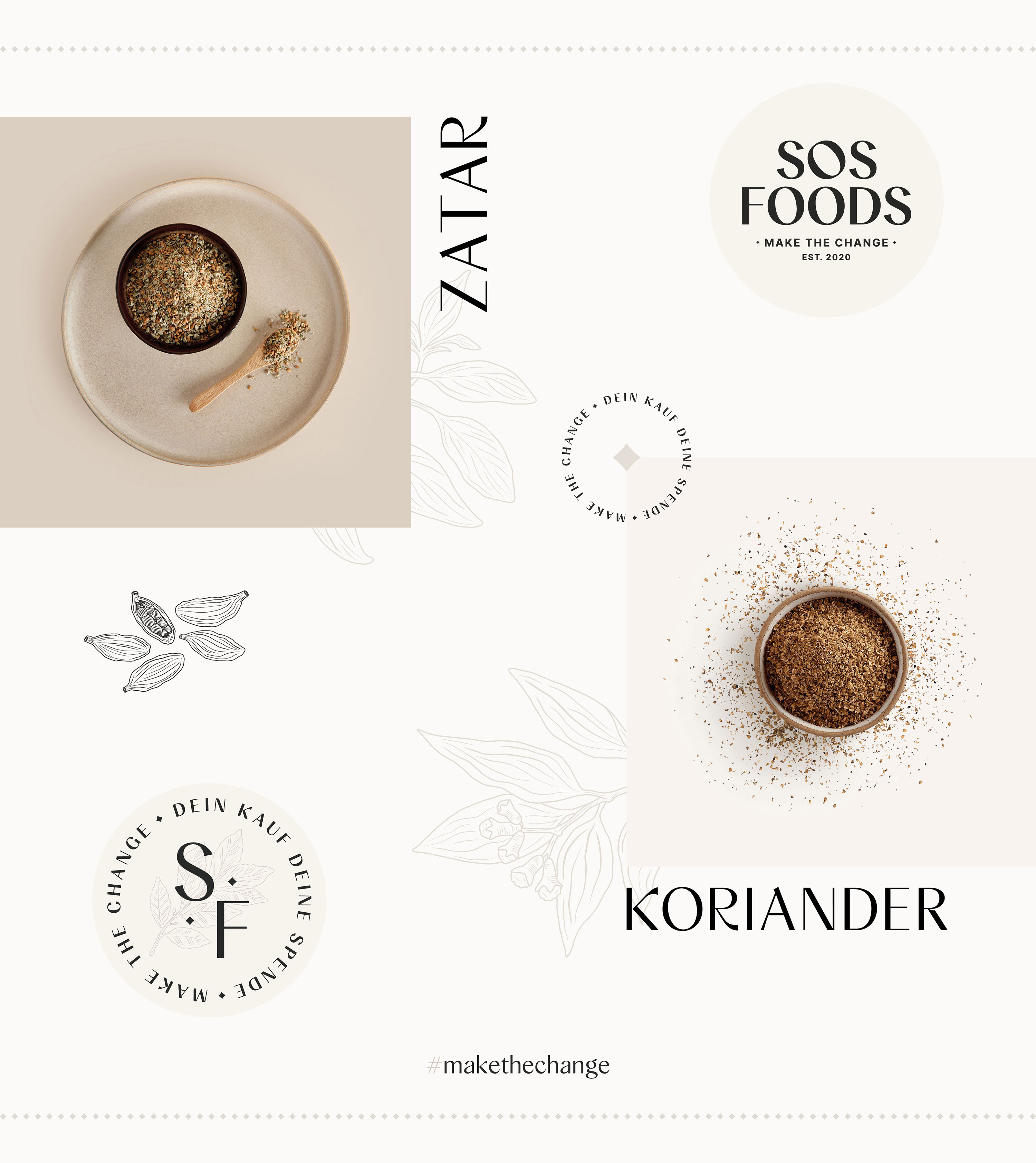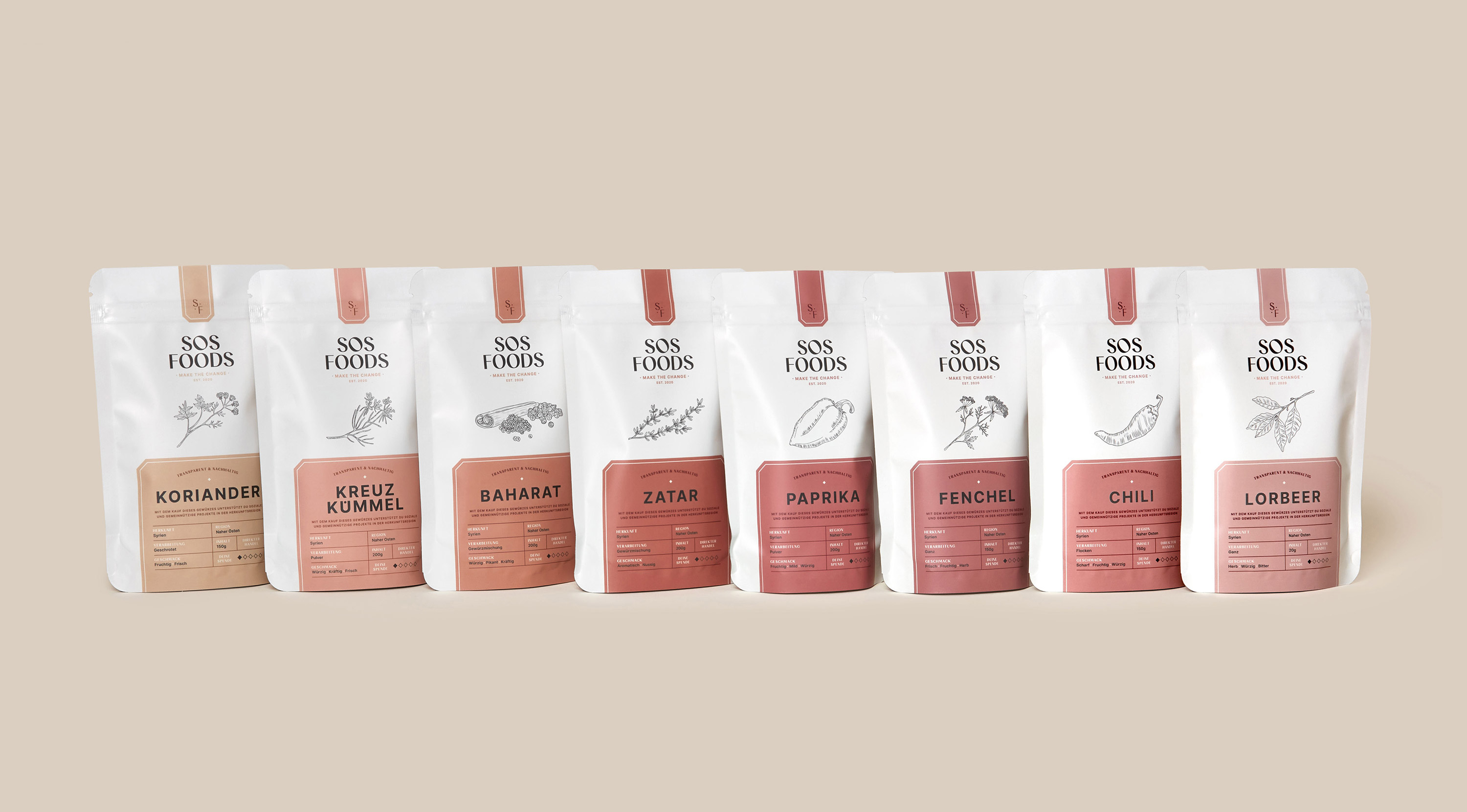 我們?cè)诎b設(shè)計(jì)中加入了許多小細(xì)節(jié)。透明度的想法是兩位創(chuàng)始人 Felix & Rami 最重要的觀點(diǎn)之一。因?yàn)闆]有什么可隱瞞的,所以一切都在產(chǎn)品上透明地傳達(dá)。小菱形還顯示了捐贈(zèng)的百分比。為了在視覺上支持透明的理念,所有重要的信息,如香料的來(lái)源、加工和口味,都以表格形式傳達(dá)。作為包裝的核心設(shè)計(jì)元素,我們選擇了精美的手繪插圖。每個(gè)產(chǎn)品都有自己獨(dú)特的線條圖,這些線條圖在網(wǎng)站上栩栩如生。產(chǎn)品系列柔和的顏色漸變、菱形圖案的設(shè)計(jì)、包袋底部的隱藏信息——所有這些都為 SOS Foods 的外觀錦上添花。