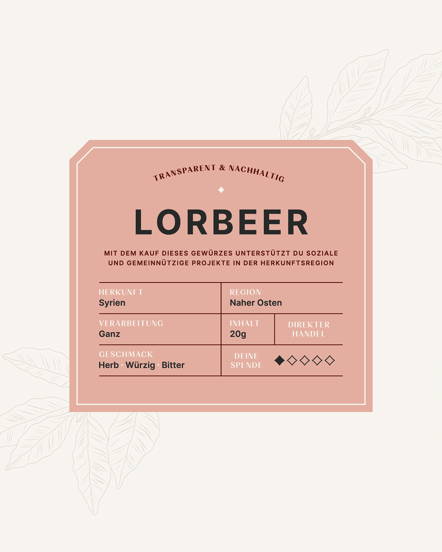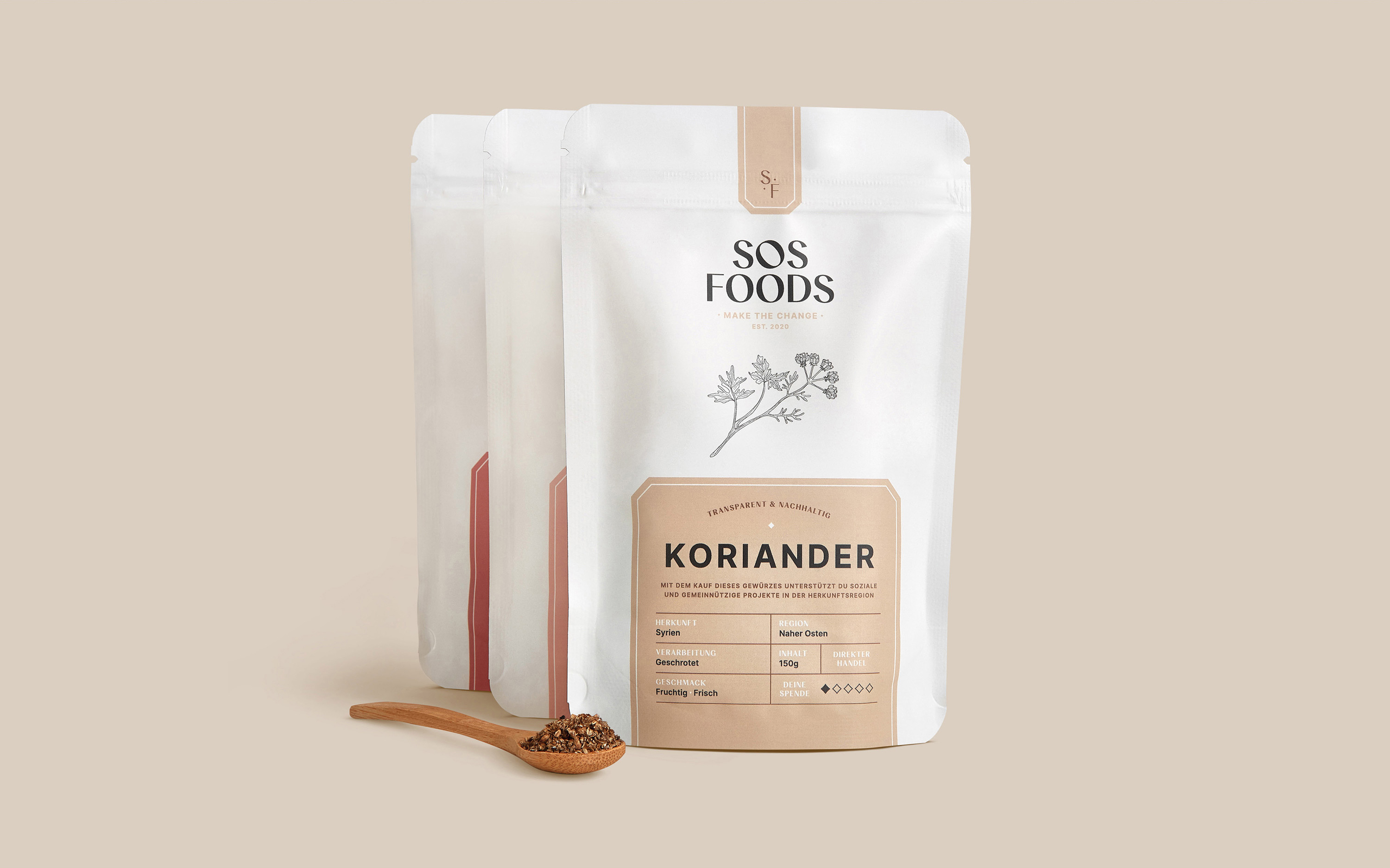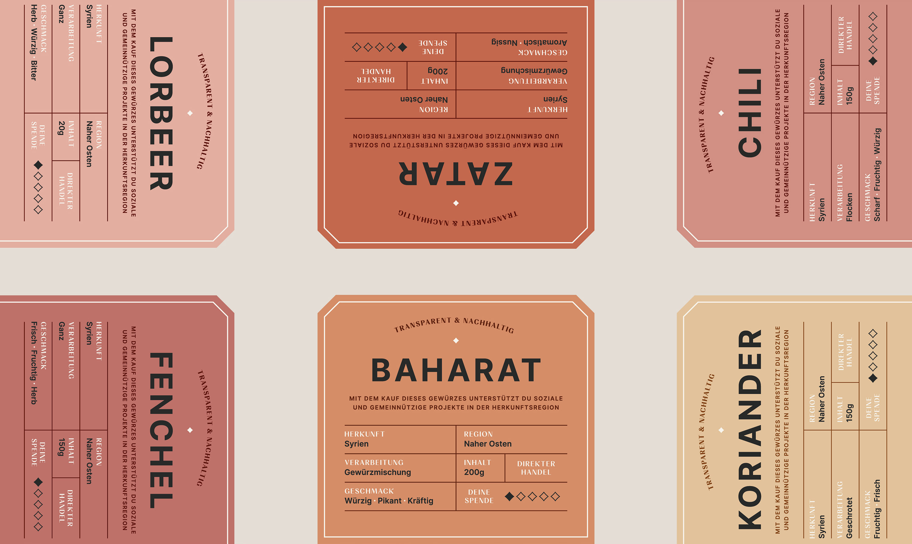 天然產(chǎn)品、與公平條件的個(gè)人接觸、可持續(xù)的包裝解決方案和透明的捐贈(zèng)出版物——帶著這一使命,兩位創(chuàng)始人 Felix 和 Rami 希望提高對(duì)食品行業(yè)不滿的認(rèn)識(shí)并重新建立公平貿(mào)易。此外,每售出一次產(chǎn)品,就有20%的營(yíng)業(yè)額流入原產(chǎn)地的社會(huì)項(xiàng)目,以直接幫助現(xiàn)場(chǎng)和支持人民。該項(xiàng)目以來(lái)自敘利亞的 8 種香料開始:孜然、茴香、辣椒粉、辣椒、香菜、巴哈拉特、扎塔爾和月桂葉。