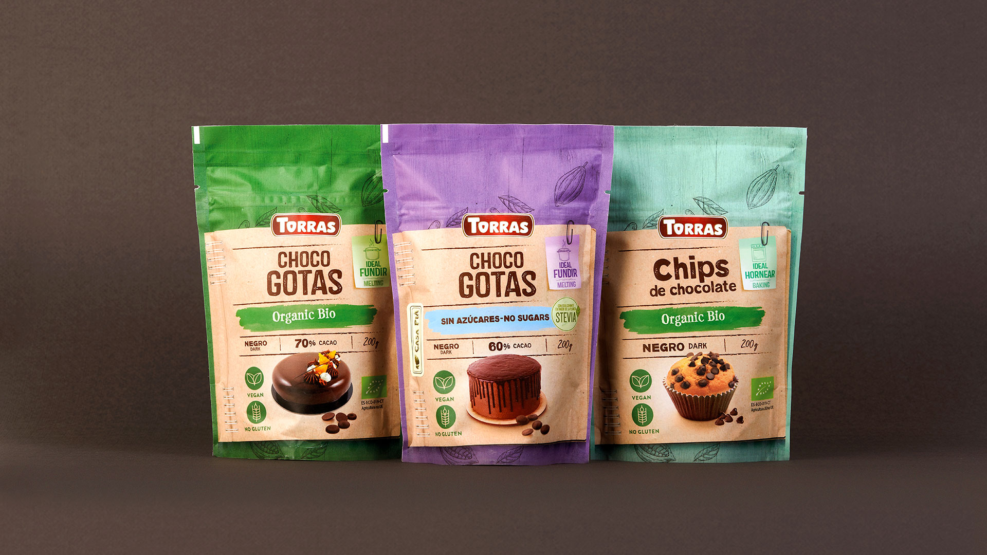 大量象形圖(素食、無麩質(zhì)、ECO 認(rèn)證、甜葉菊)以增加價值并傳達每個品種的特性。一種中央飛濺的顏色,傳達了使其與競爭對手區(qū)分開來的相關(guān)特征:有機生物和無糖。成品配方的靜物,具有很強的存在感,以增強產(chǎn)品的教學(xué)用途,并讓消費者了解可以制作什么。帶有木質(zhì)紋理的柔和彩色背景和可可豆莢插圖,以加強品種之間的差異以及產(chǎn)品的自然性和質(zhì)量。允許范圍容易地擴展到其他參考和格式的設(shè)計。