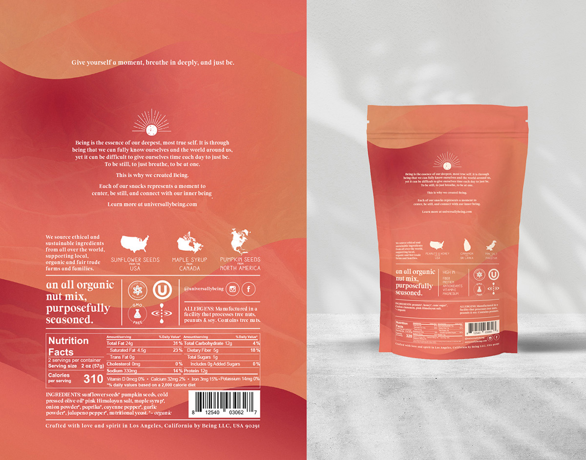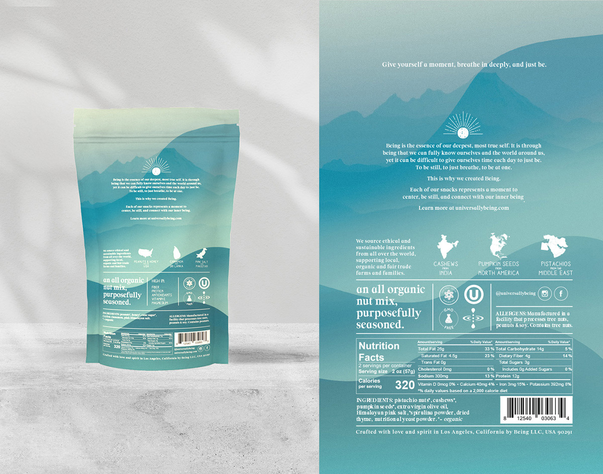 極簡(jiǎn)主義:查看市場(chǎng)和類別,我們發(fā)現(xiàn)很少有產(chǎn)品在調(diào)味混合堅(jiān)果領(lǐng)域競(jìng)爭(zhēng),并希望整個(gè)包裝都能反映出這不是您常用的堅(jiān)果類零食。我們的目標(biāo)是讓人賞心悅目,讓心靈平靜,只提供完美代表產(chǎn)品本身的基本信息:沒有添加劑,沒有炒作,只有來(lái)自大自然的基本成分。